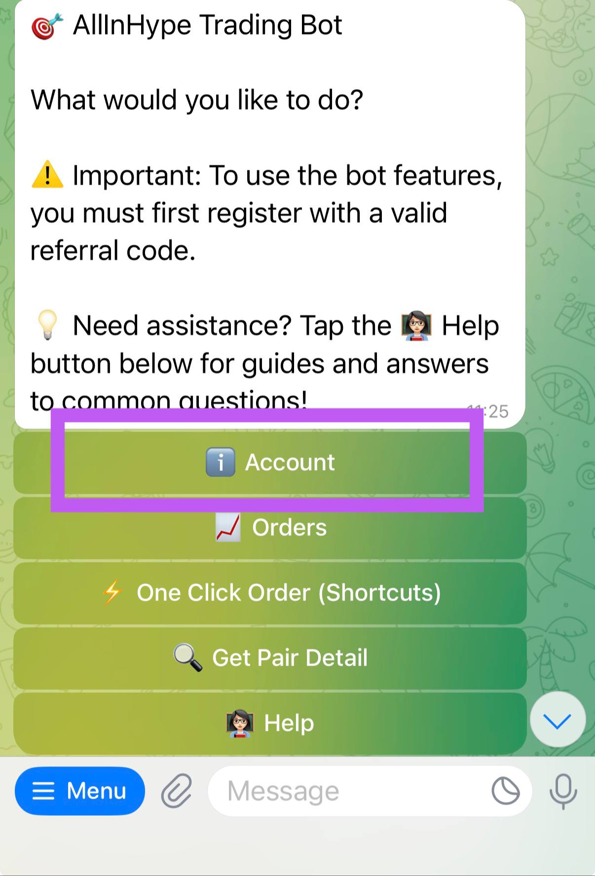 The Account section is your home base inside All In Hype. From here, you can register, review your profile, see balances and positions, manage transfers, and access your referral tools. You can open it anytime in Telegram by tapping the “Account” button on the bot’s main menu.