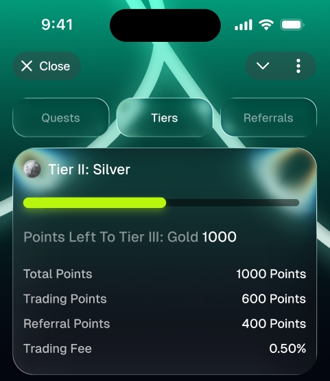 Trading Points: Points earned from executed trading volume, maintaining open positions, or completing specific trading quests. Increase these by increasing your trading activity or reaching volume milestones.