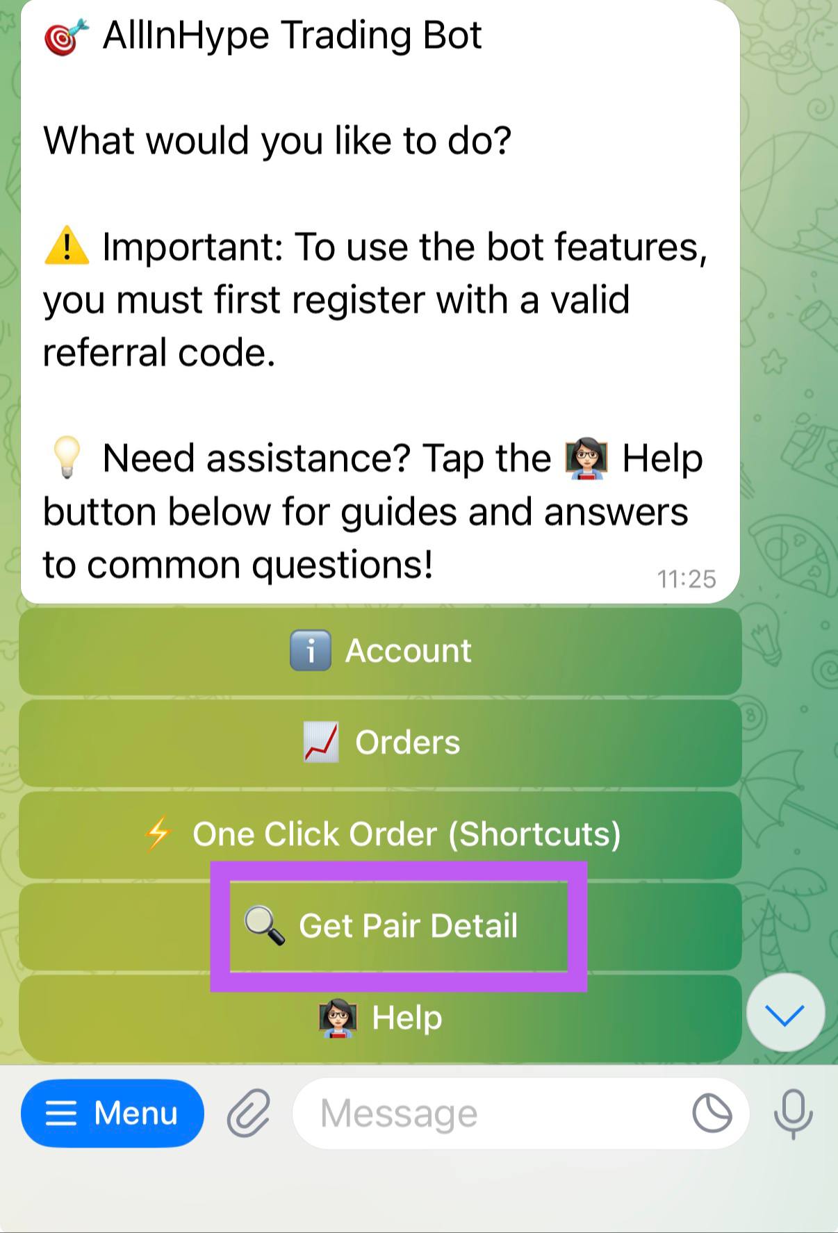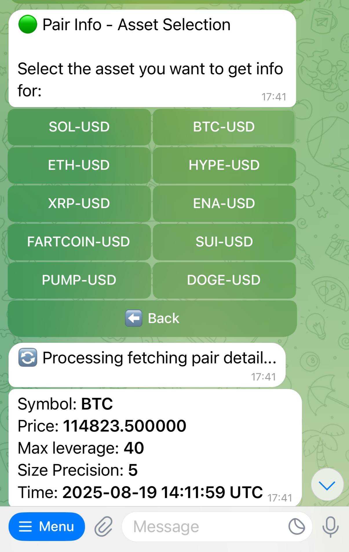 To view live token prices in the mini-app, select either Spot or Perpetual in the Trade tab. This will display a list of available tokens, along with their charts and price changes.